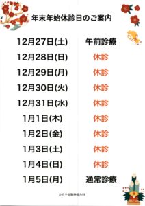 年内の診療は12月27日(土)の午前まで。年始は1月5日(月)から診療開始となります。